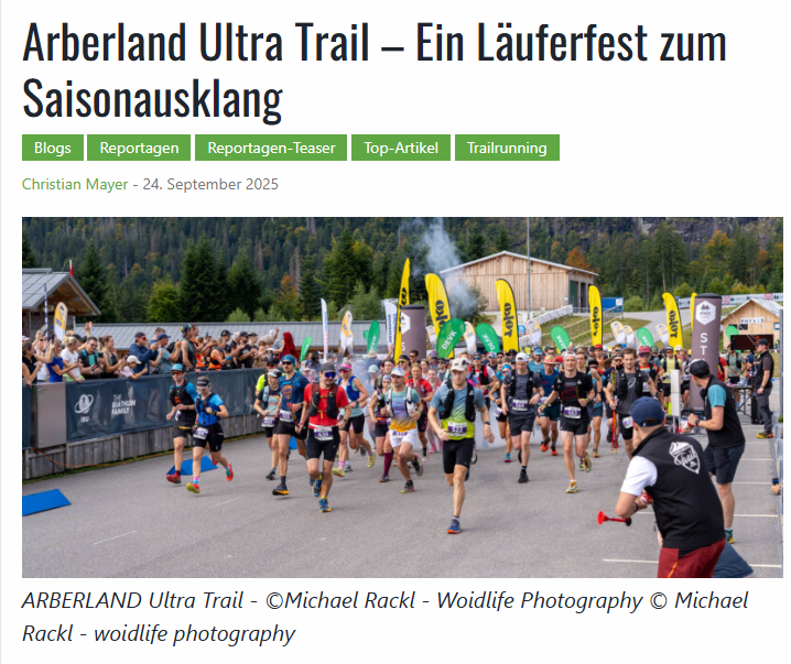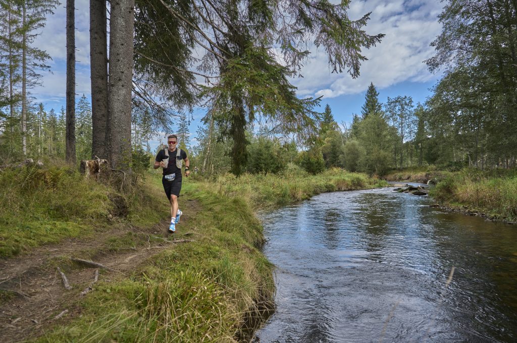 Das Laub raschelt unter den Laufschuhen, der eigene Atem bildet kleine Wölkchen in der herbstlich kühlen Luft, dunkelorange Blätter filtern Sonnenstrahlen durch den Wald und tauchen die Strecke in ein weiches Licht und plötzlich steht man oben, am Gipfel. Im Tal wabern die letzten Nebelschwaden und in der Ferne kann man die Alpengipfel erahnen. Der Blick schweift über die bereits erklommenen Berge, nun geht es fast nur noch bergab bis ins Ziel. Die Fernsicht ist berauschend, der Bayerische Wald liegt einem zu Füßen!